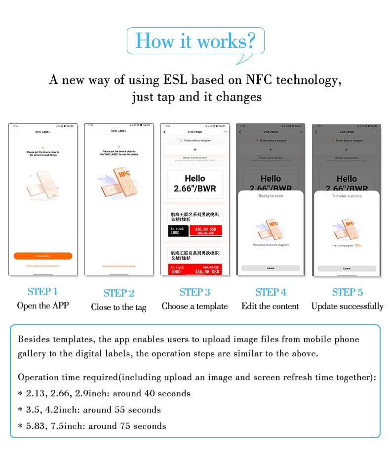 Aceasta este o etichetă digitală care poate fi reîmprospătată prin NFC al telefonului mobil. Accelerează intrarea ecranelor de hârtie în mai multe scenarii de aplicații, inclusiv retail, birouri, spații publice etc.